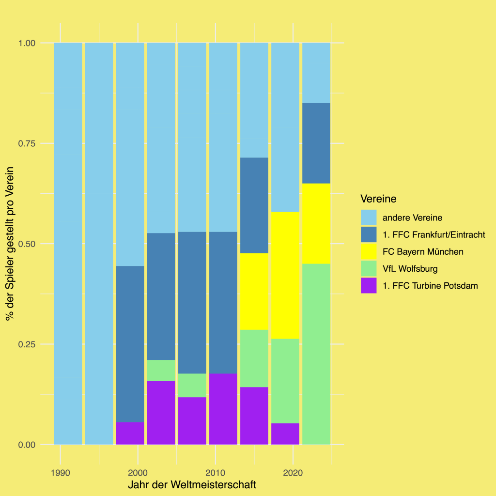 Abbildung 1 zeigt, welche Vereine bei den Weltmeisterschaften die meisten Spielerinnen für die deutsche Nationalmannschaft gestellt haben. Im Laufe der Zeit hat die Vereinszusammensetzung des WM Kaders stark verändert. Bei den ersten beiden Weltmeisterschaften wurden maximal 3 Spielerinnen vom gleichen Verein nominiert (TSV Siegen). Ab der 3. Weltmeisterschaft wurden ca. 50% der Spielerinnen von insgesamt 4 Vereinen gestellt. Zuletzt wurden bei der WM 2023 neun Spielerinnen vom VfL Wolfsburg nominiert und nur 23% Prozent des Kaders kamen nicht von den 4 größten Vereinen.